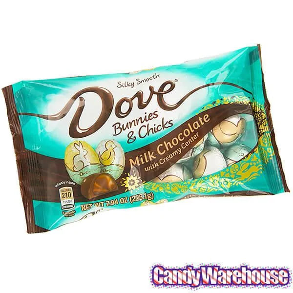 Perfect for the Easter candy dish, these Dove silky smooth milk chocolates with creamy chocolate centers are wrapped with elegant metallic foils featuring bunnies and chicks.