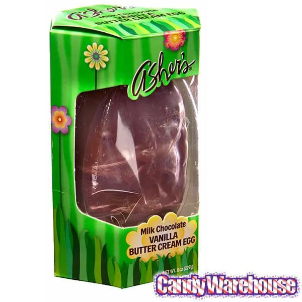 Gift box contains 1 Milk Chocolate Butter Cream Egg with a net weight of 8 ounces.