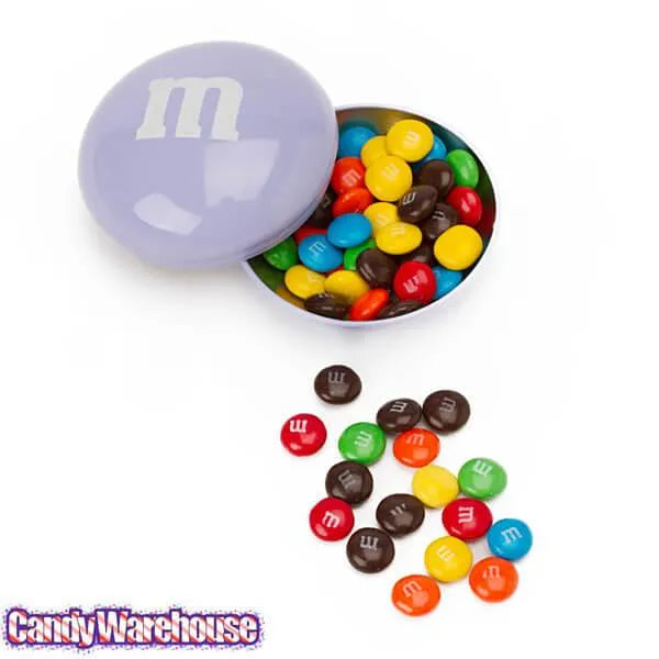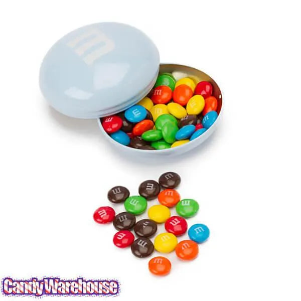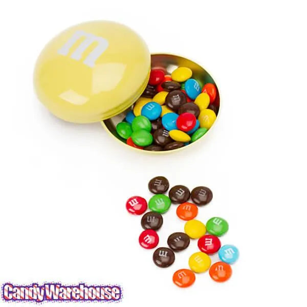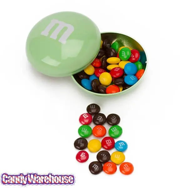 Classic milk chocolate M&M's candies are packed inside miniature metal tins in an assortment of pastel colors. Perfect for Easter baskets and wedding favors!