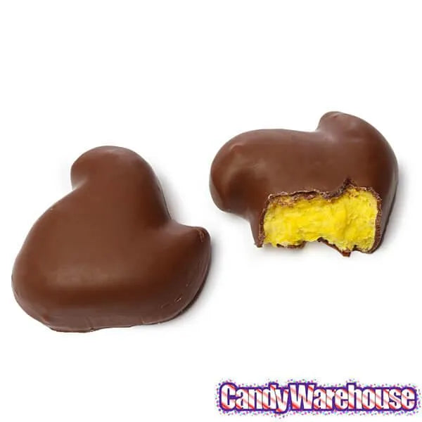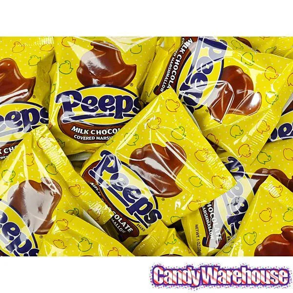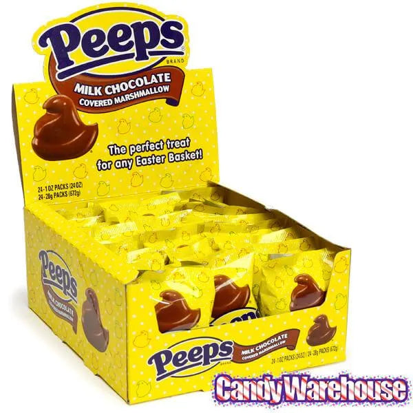 Display box contains 24 packs of Peeps Milk Chocolate Covered Marshmallow Chicks. Each with a net weight of 1 ounce.