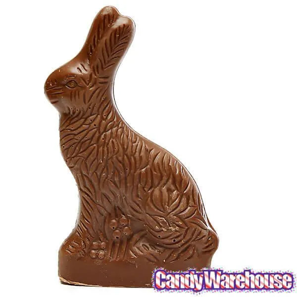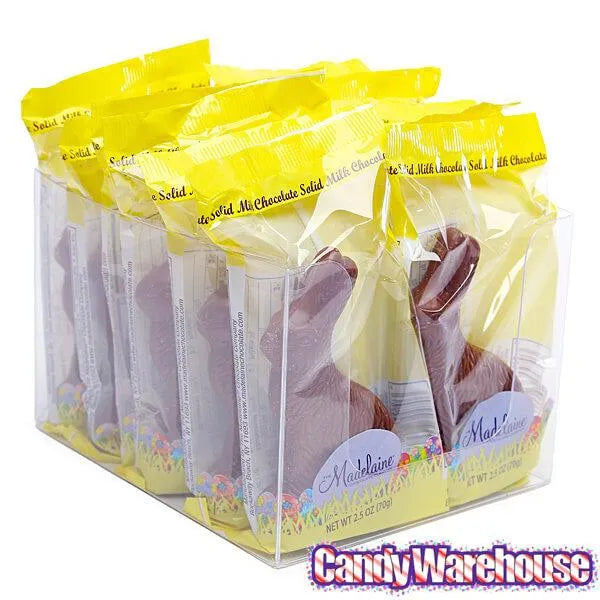 Display box contains 12 Solid Milk Chocolate Sitting Easter Bunny Packs, each with a net weight of 2.5 ounces.