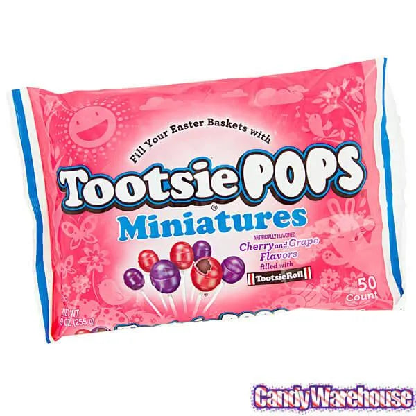 Bag contains 50 Cherry and Grape Easter Mini Tootsie Pops.