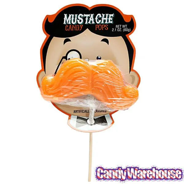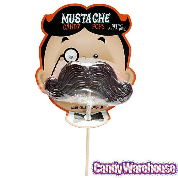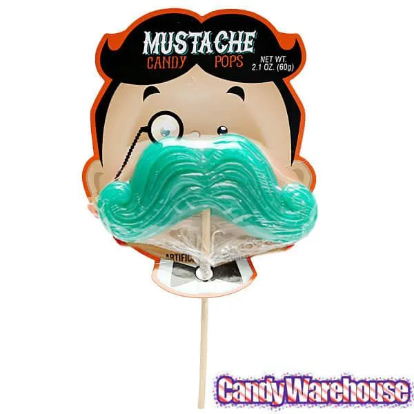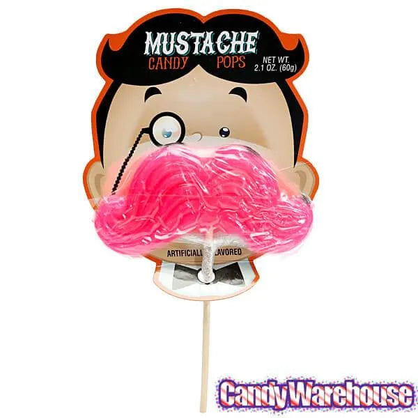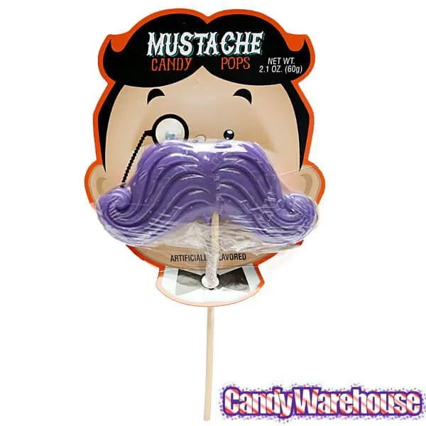Display box contains 12 Mustache Candy Pops in various colors.