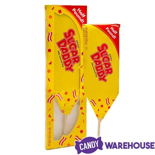 Behold the wonder of the Giant Sugar Daddy lollipop! Made from 100% pure slow cooked caramel, this big Sugar Daddy Pop weighs in at a massive 1/2 pound and comes packaged in a full length box, making it easy to gift wrap. The perfect present for any candy lover, this impressive work of art is sure to surprise and delight!