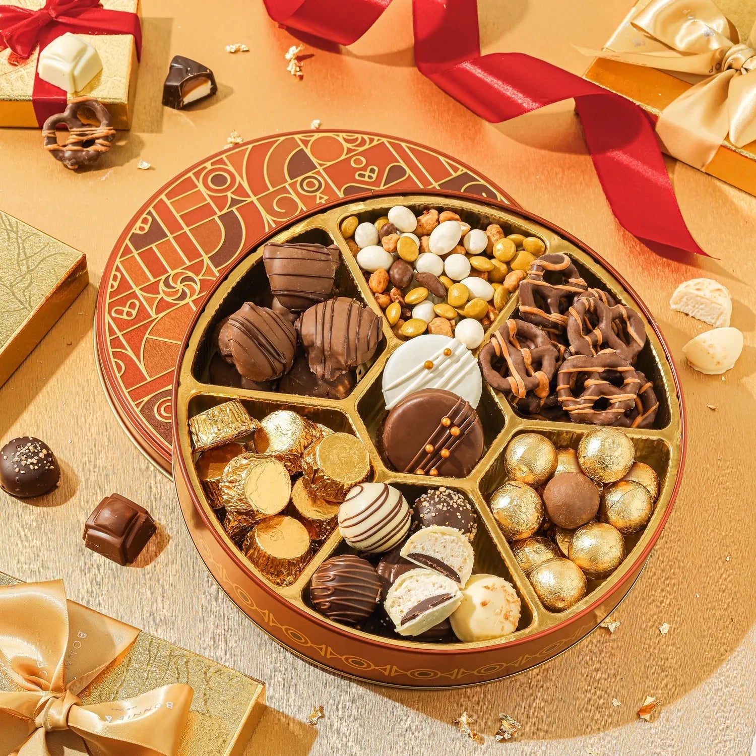 Caramel Drizzled Pretzels, Double Chocolate Foiled Balls, Belgium Chocolate Truffles, Dark Chocolate Peanut Butter Cups, Pecan Snappers, Cashew Clusters, Toffee Peanuts, Yogurt Peanuts, Chocolate Peanuts, Milk and White Chocolate Covered Oreos.