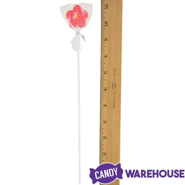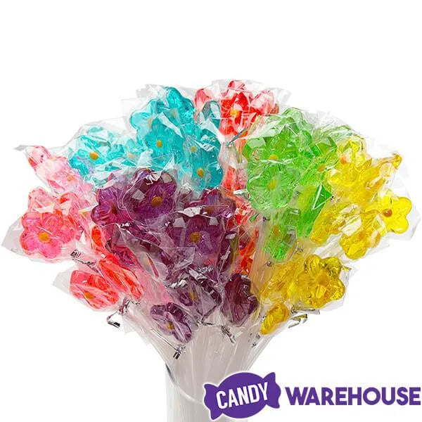 It’s bouquet time! These cute flower lollipops on long, flexible sticks are colorful and yummy – and easy to arrange into a floral bouquet! Their cheerful translucent colors and juicy flavors will bring smiles to everyone around – at home, at the office, or wherever you choose to spread the joy. They make great party favors or event take-a ways, too. The total length of these lollipops is about 11 inches and each flower is individually wrapped with cellophane.