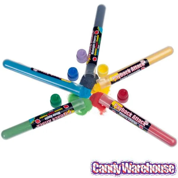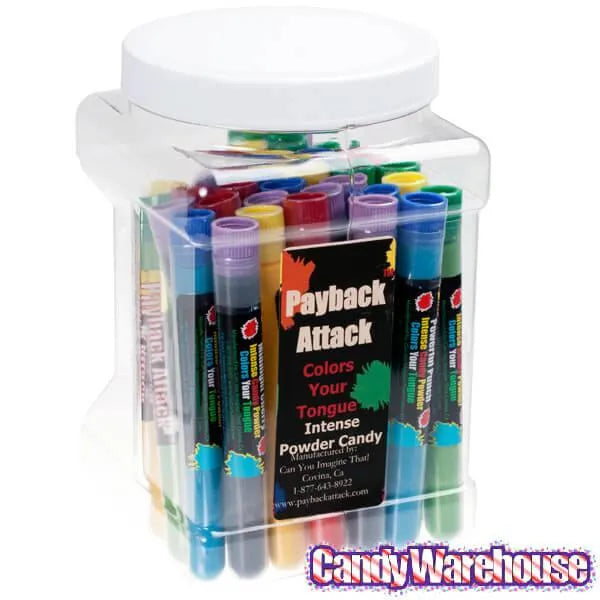 Acrylic tub contains 35 assorted Payback Attack Sour Powder Candy Test Tubes. Made in the USA.