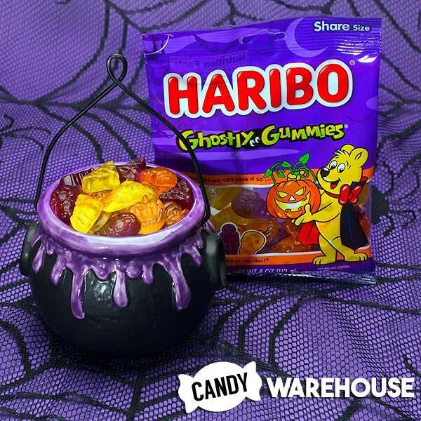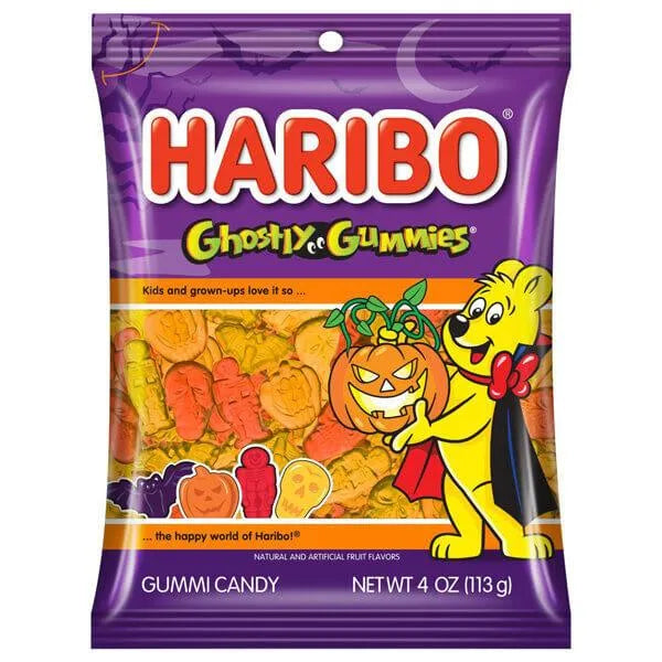 Box contains 3 pounds of Haribo Halloween Ghostly Gummi Candy packed in 12 bags, each with a net weight of 4 ounces.