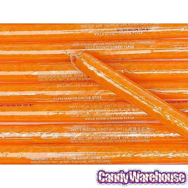 Box contains 100 individually wrapped Mango Hard Candy Sticks.