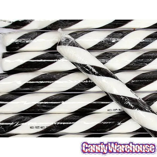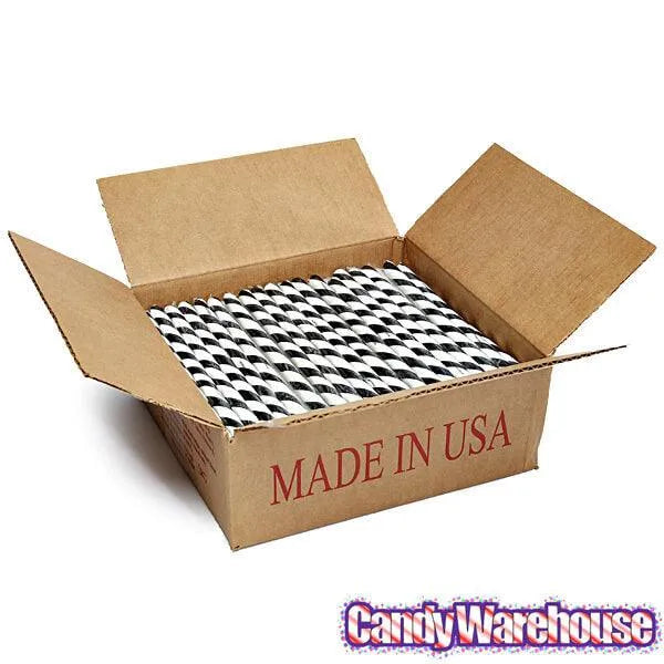 Box contains 100 cellophane-wrapped White with Black Stripes Mint Hard Candy Sticks.