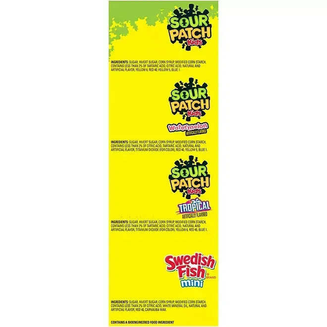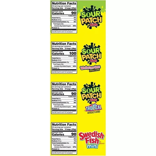 Dive into 200 snack packs of pure chewy delight with this Sour Patch Kids and Swedish Fish Mini variety pack! Inside, you'll find Sour Patch Kids Original, Watermelon, and Tropical flavors, along with Swedish Fish Minis—perfect for every craving. These fun-sized snack packs are perfect for munching on the go, slipping into lunchboxes, or sharing at parties, holidays, movie nights, and more. Plus, the sealed bag ensures each treat stays fresh, soft, and oh-so-flavorful!
