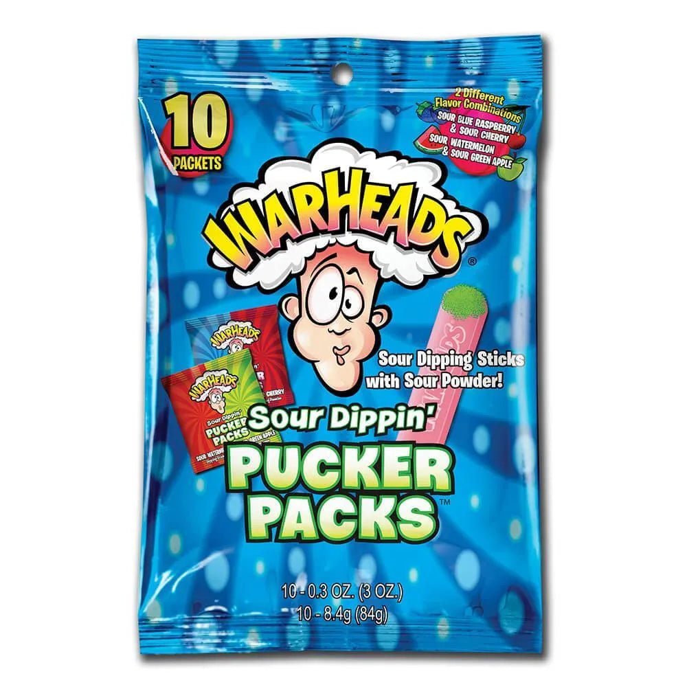 Box contains 120 packs of WarHeads Sour Dippin' Pucker Candy.