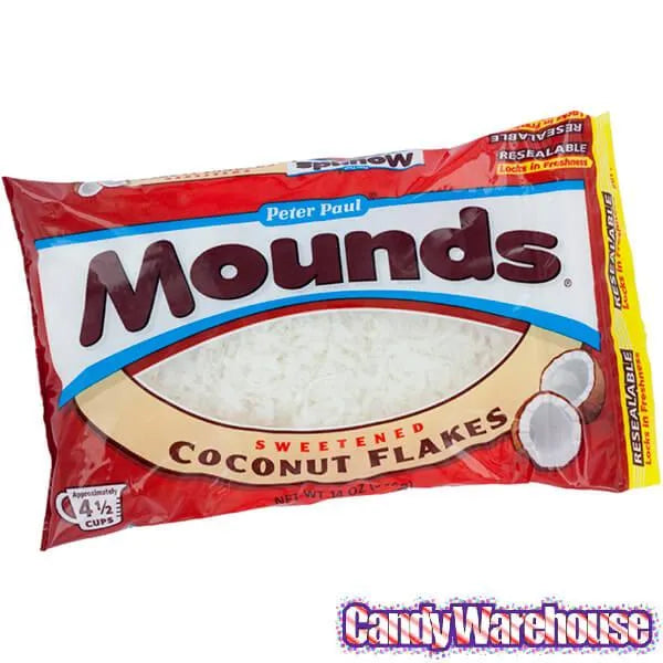 Bag contains 14 ounces of Mounds Sweetened White Coconut Flakes.