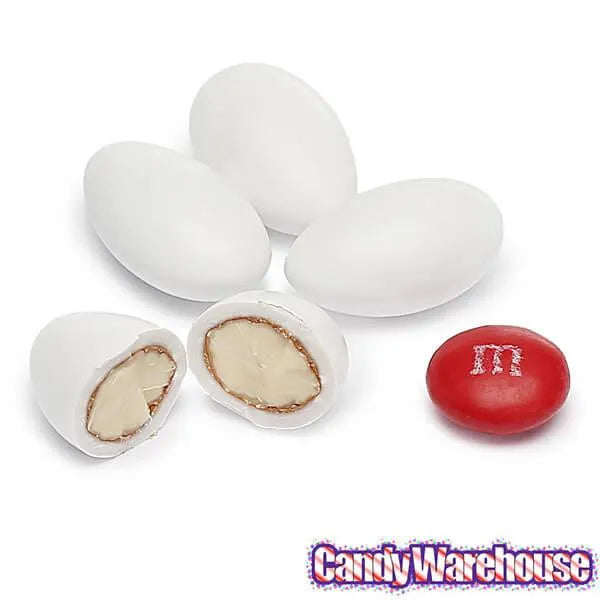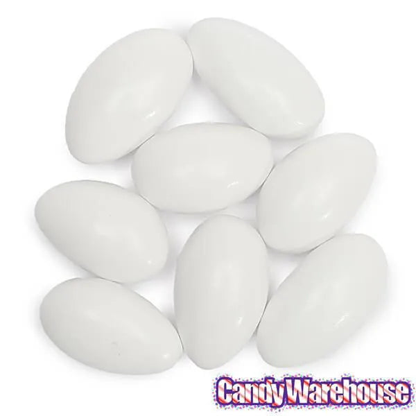 Case contains 10 pounds of Sconza White Jordan Almonds Candy.