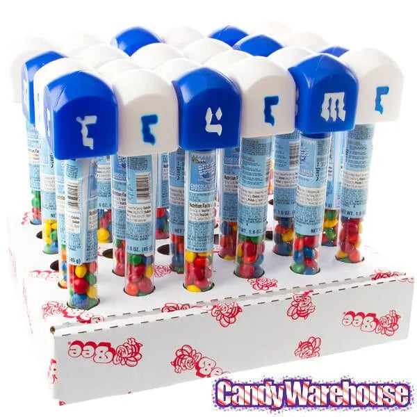 Display box contain 24 Hanukkah Dreidel Candy Tubes filled with Blue & White Milk Chocolate Lentils.