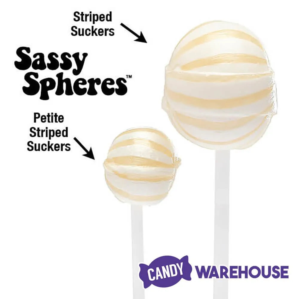 Bag contains 400 individually wrapped White Sassy Suckers Petite Striped Ball Lollipops.