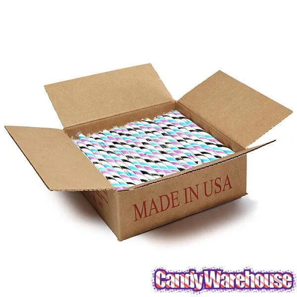 Delicious blue raspberry flavors burst from these gourmet hard candy sticks featuring colors of pastel blue, white, pink, and black.