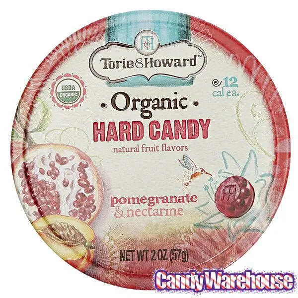 Display box contains 8 Pomegranate & Nectarine Torie and Howard Hard Candy Tins, each with a net weight of 2 ounces.