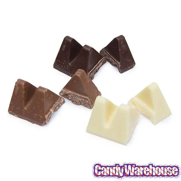 Tiny bars of Toblerone chocolate in three delicious flavors:White ChocolateMilk ChocolateDark Chocolate
