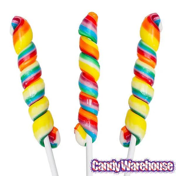 Twisting, rainbow color strawberry-banana flavor swirled lollipops on a stick! These spiraling suckers look like the colorful horns of candy unicorns.... rainbows and unicorns.... are you dreaming?!?