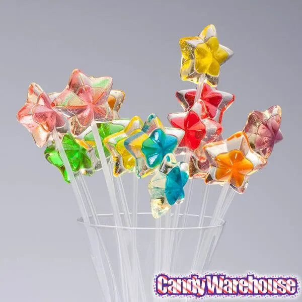 Cast a spell on your taste buds with these star-shaped lollipops! Sporting long, flexible sticks, they make perfect wands for wanna-be princesses, or bundle them in bouquets for a gifts or party favors. With bright colors and tasty flavors, they’ll make your mouth tingle and your eyes twinkle. The total length of these lollipops is about 12 inches and each star is individually wrapped with cellophane. Assortment includes 7 translucent colors and fruit flavors: