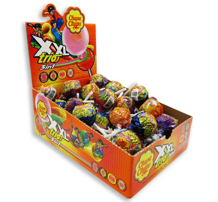 Indulge in a burst of fun with the Chupa Chups XXL Trio 3-in-1 Lollipop Assortment. Each display box includes 48 individually wrapped, layered lollipops in four delicious flavors: Strawberry & Kiwi, Mango & Orange, Tutti Frutti & Pineapple, and Cola & Lemon, all with a chewy bubblegum center. These premium hard candy lollipops offer long-lasting enjoyment for both kids and adults. The durable plastic lollipop sticks are designed for a strong, enjoyable experience, ensuring they won’t break while you savor every bite. Perfect for sharing, this box is ideal for parties, events, pinatas, holidays, and more. Chupa Chups, the iconic brand that has been delighting taste buds since 1958, blends tradition with innovation, making it a favorite worldwide.