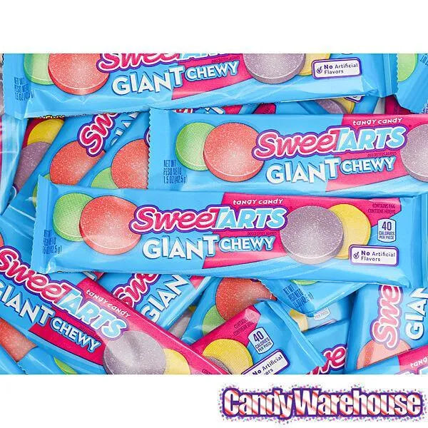 What’s better than a pack of Giant Chewy SweeTarts? A whole box of Giant Chewy SweeTarts! Each purple, blue, red, yellow, and green disk is full of perky fruit flavor, and that one-of-a-kind, slightly chewy texture that leaves you craving another pack as soon as you finish the first. Fortunately, you'll have a whole box. You might even feel like sharing.