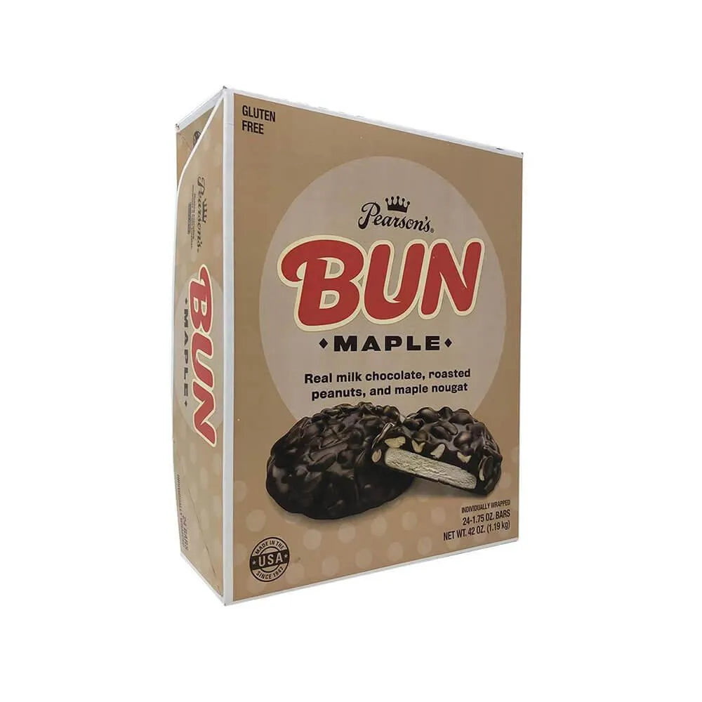 Display box contains 24 Pearson's Bun Maple & Roasted Peanut Candy Bars, each with a net weight of 1.75 ounces.