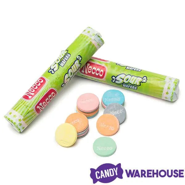 Display box contains 24 Necco Sour Assorted Wafers Candy Rolls, each with a net weight of 2.02 ounces.