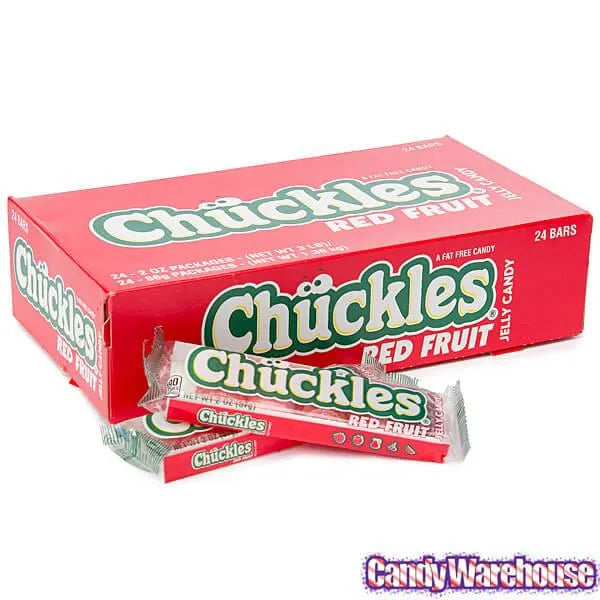 Display box contains 24 Chuckles Red Fruit Jelly Candy Packs, each with a net weight of 2 ounces.