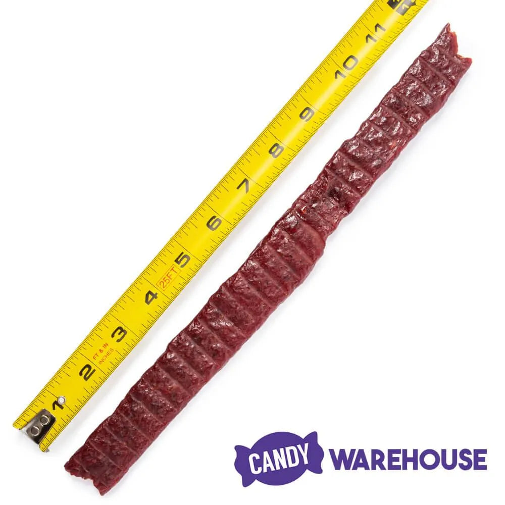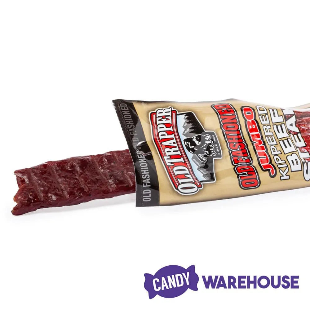 Show a ferocious snack attack who's boss when you reach for an Old Trapper Old Fashioned jumbo kippered beef steak. Meat lovers find a lot to celebrate in this 12-piece box of Old Trapper kippered beef steak made from thick strips of lean beef seasoned with a special blend of spices and a hint of brown sugar. The mouthwatering meat is smoked to perfection using real wood chips for a tender texture and the satisfying savory flavor you crave when hunger hits. Each individually wrapped piece of Old Fashioned kippered beef jerky is approximately 11 inches long, providing a protein-packed pick-me-up for post-workout fueling or after-school snacking. Shop the full line of high-quality Old Trapper meat snacks at Candy Warehouse, where hunting down your favorite flavor is a cinch.