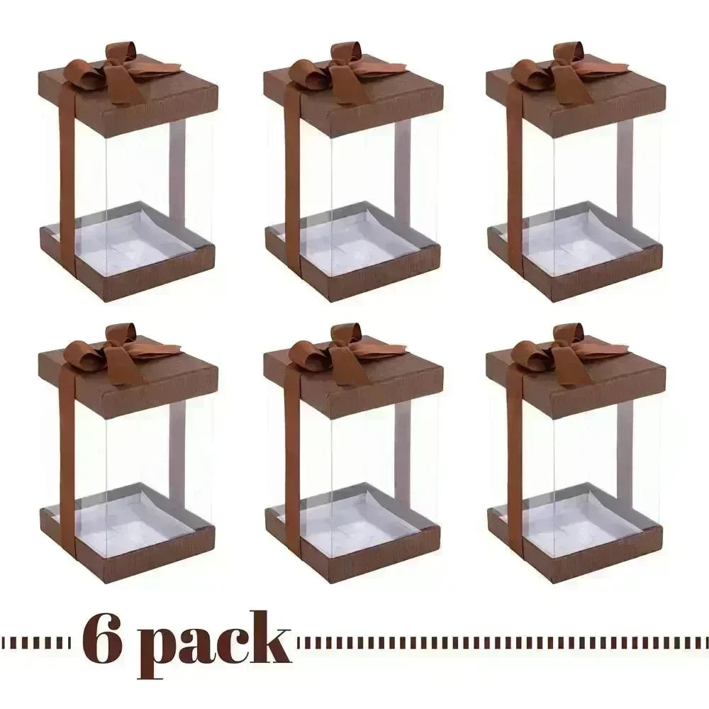 Introducing our Clear Plastic Gift Boxes: 6 Pack Bakery Boxes, a stunning solution for showcasing your delectable treats. Designed with utmost care, each box is accompanied by a practical base lid and a charming brown ribbon. With dimensions of 8X4X4", these boxes provide ample space to present your baked goods with elegance and style.