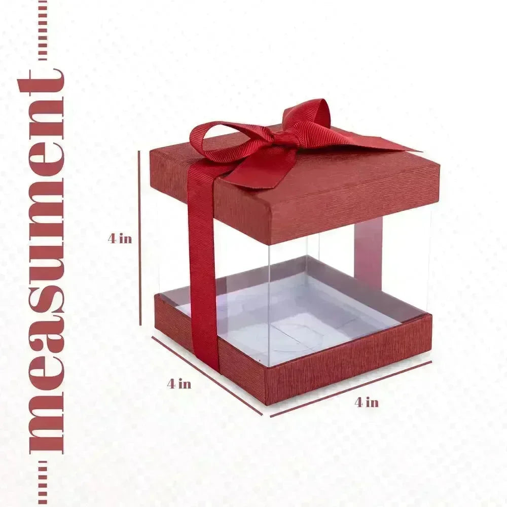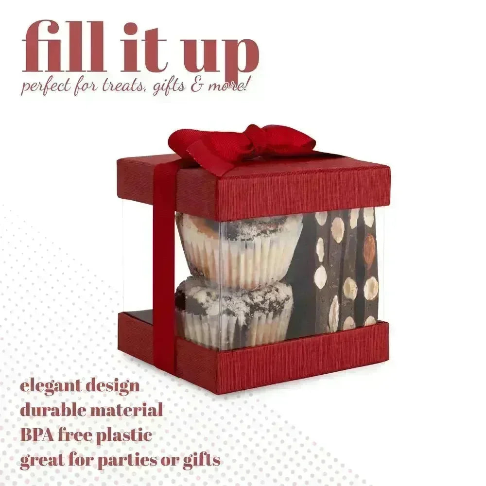 Introducing our exquisite Clear Plastic Gift Boxes: 6 Pack Bakery Boxes in a stunning maroon color, ideal for Christmas party favors. These remarkable boxes come complete with a practical base lid and a coordinating ribbon, offering both functionality and festive charm. With dimensions measuring 4X4X4", these boxes provide a compact and stylish solution for presenting delightful Christmas treats or gifts during your festive celebrations.