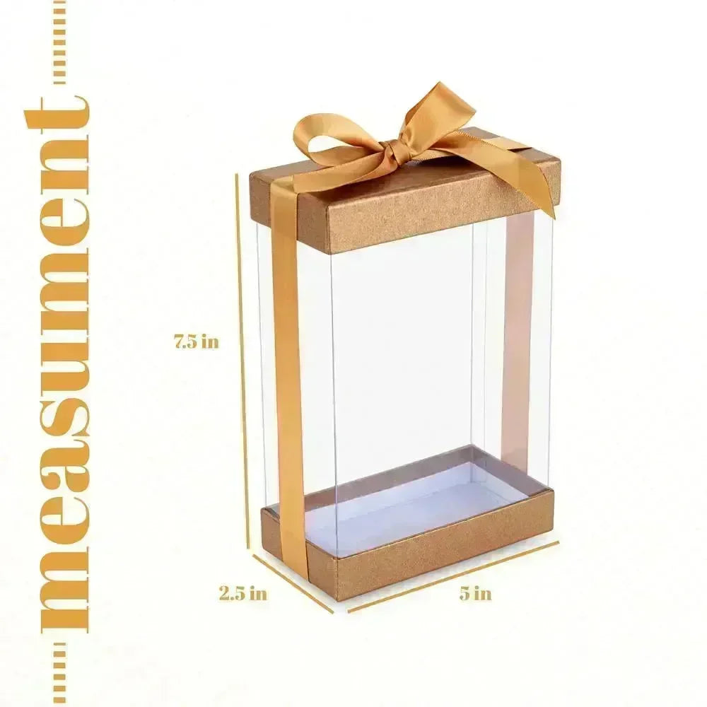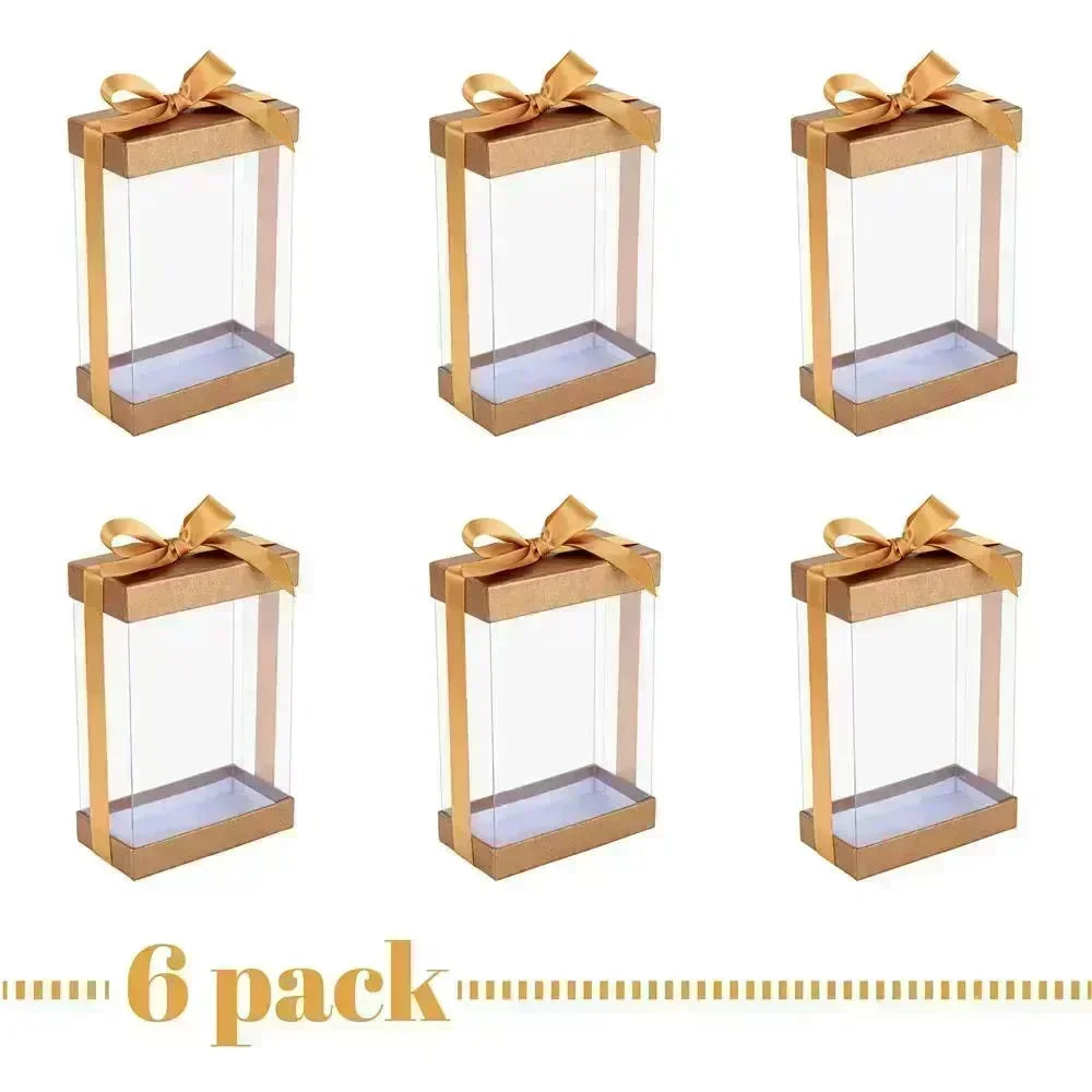 Introducing our exquisite Clear Plastic Gift Boxes: 6 Pack Bakery Boxes, designed to add a touch of elegance and sophistication to your bakery treats. Each box is thoughtfully crafted with a practical base lid and a luxurious gold ribbon, creating a stunning presentation that will impress your recipients. With dimensions of 7.5X5X2.5", these boxes offer the perfect size to showcase your delectable creations.
