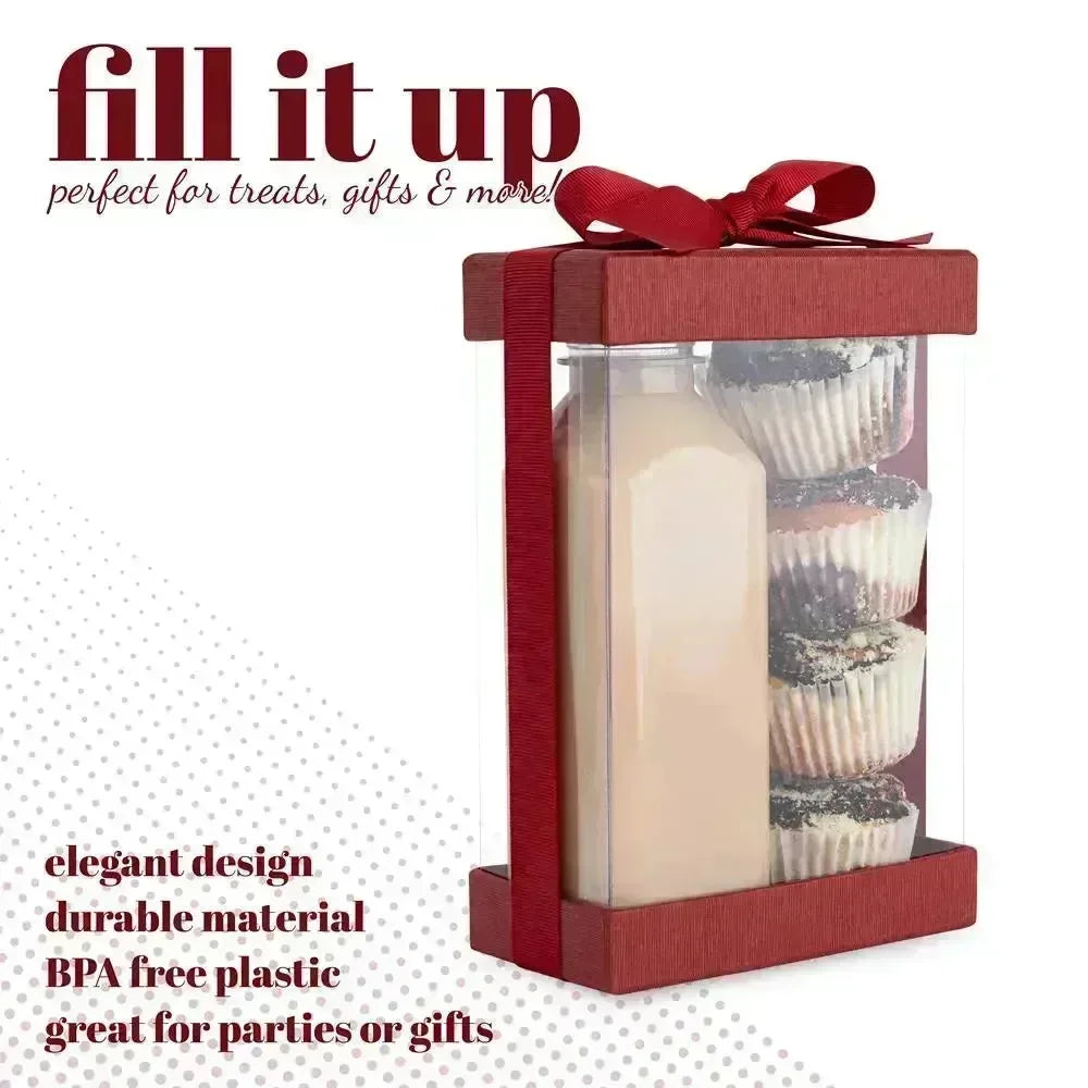 • Make your Christmas gifting even more delightful with our Clear Plastic Gift Boxes. This 6-pack of bakery boxes comes complete with a base, lid, and coordinating ribbon, all elegantly designed in a rich maroon color. Measuring 7.5" x 5" x 2.5", these boxes provide the perfect size for creating festive and inviting Christmas goodie gifts.