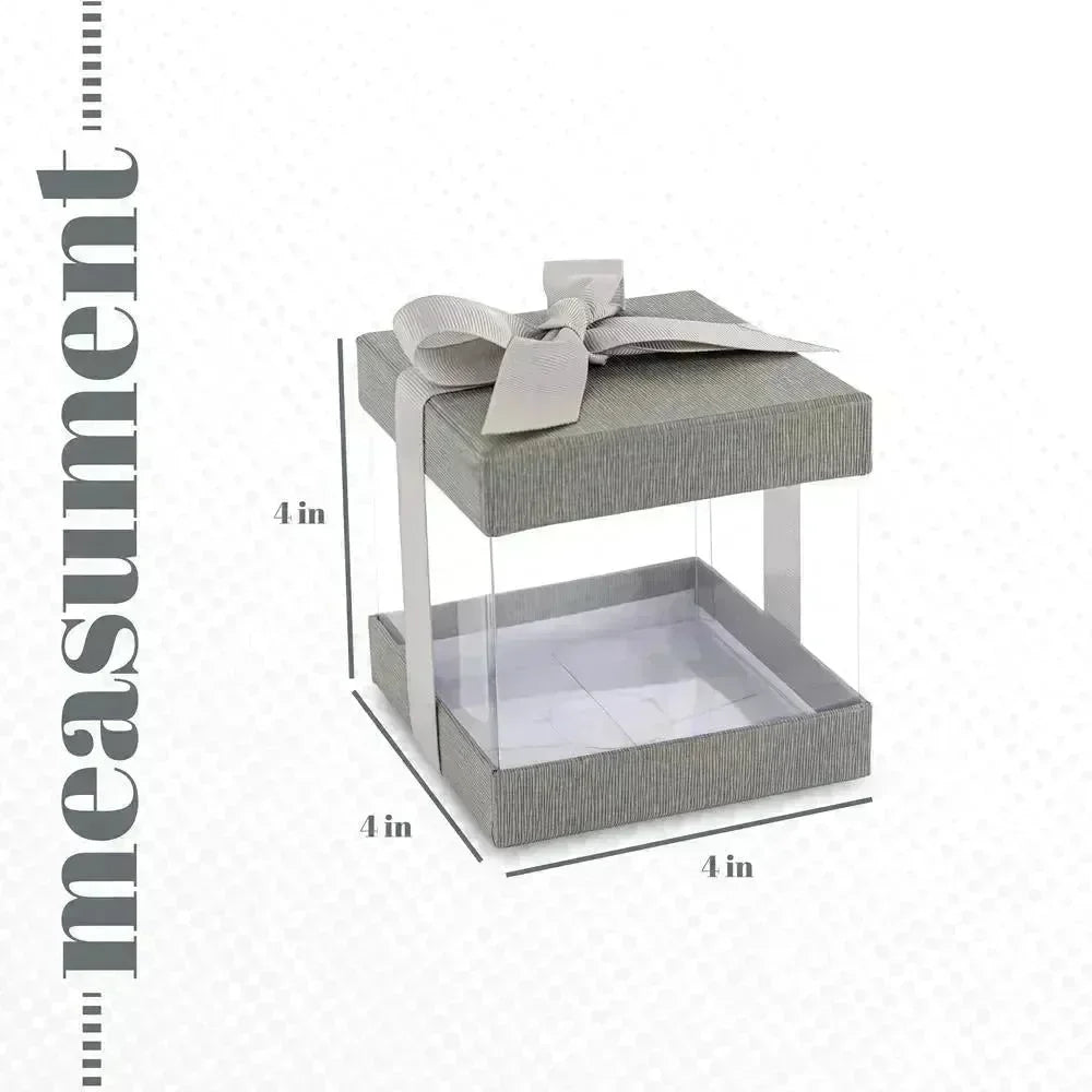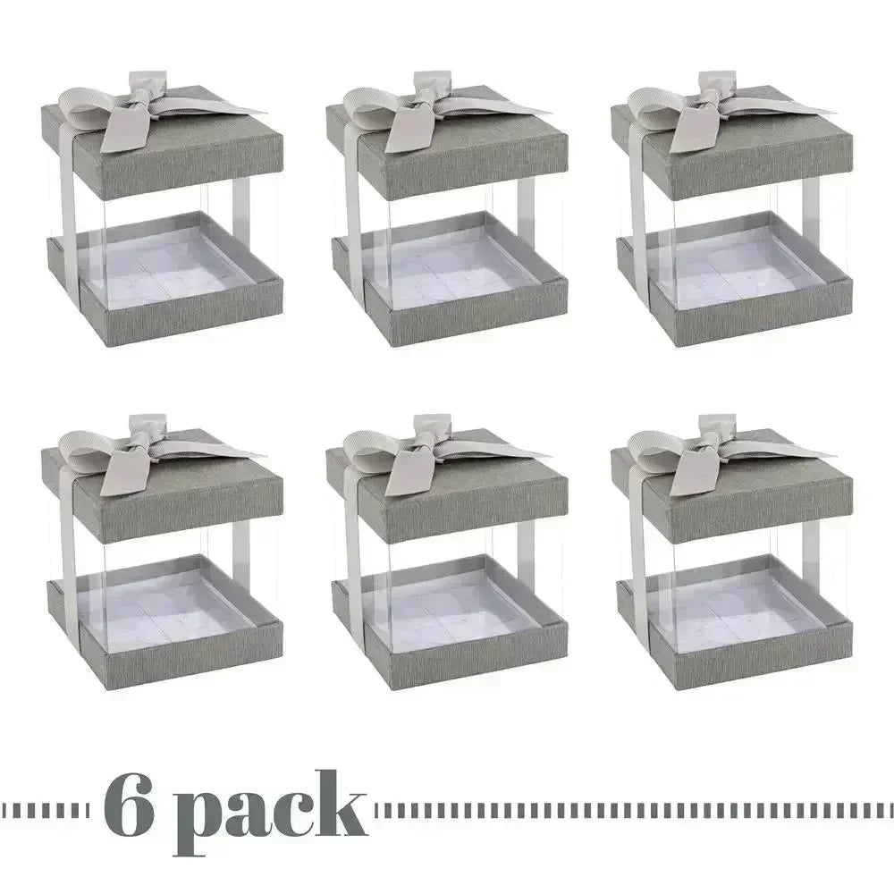 Introducing our Clear Plastic Gift Boxes: 6 Pack Bakery Boxes in an elegant gray color. These versatile boxes come with a convenient base lid and a coordinating ribbon, perfect for showcasing a single item. With dimensions of 4X4X4", they provide an ideal size for highlighting your special treat or gift.