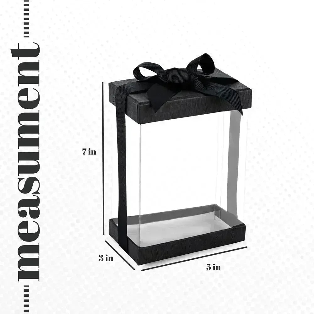 Introducing our Clear Plastic Gift Boxes, designed to add a touch of elegance and style to your gift-giving experience. This 6-pack of bakery boxes includes a base, lid, and ribbon, all in a sleek black design. With dimensions of 7x5x3 inches, these boxes provide ample space to showcase your special gifts in a stunning and sophisticated manner.