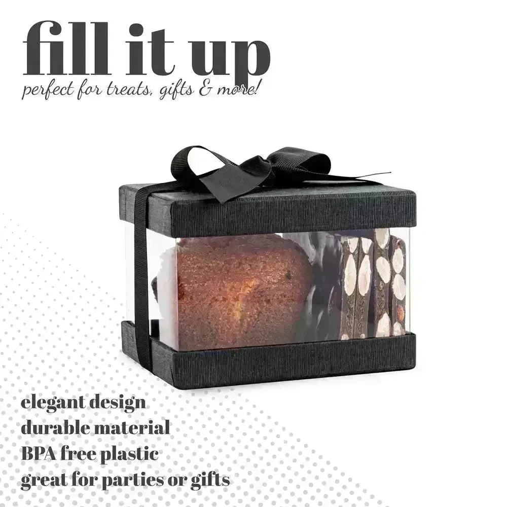 Presenting our Clear Plastic Gift Boxes, the epitome of elegance and sophistication, perfect for making a lasting impression at special occasions. This 6-pack of bakery boxes is specifically designed to serve as exquisite party favors or fancy gift packaging. With their sleek black design and dimensions of 5x4x3.5 inches, these boxes are the ideal choice for creating an upscale and luxurious gifting experience.
