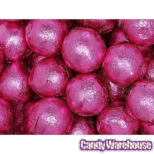 Bag contains 5 pounds of Bright Pink Foiled Caramel Filled Chocolate Candy Balls.