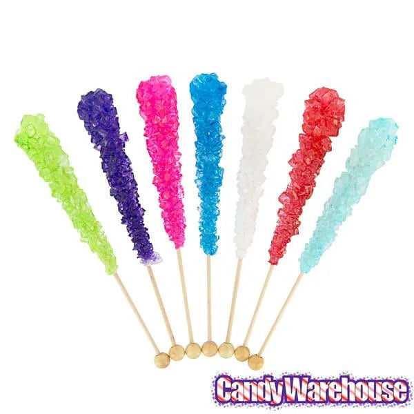 A fabulous assortment of rock candy crystal sticks wrapped in cellophane. Formed by nature itself, these crystalline candy structures are unique and delicious.