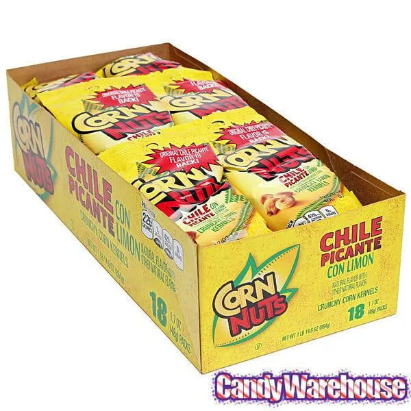Box contains 18 Chile Picante Corn Nuts Packs, each with a net weight of 1.7 ounces.