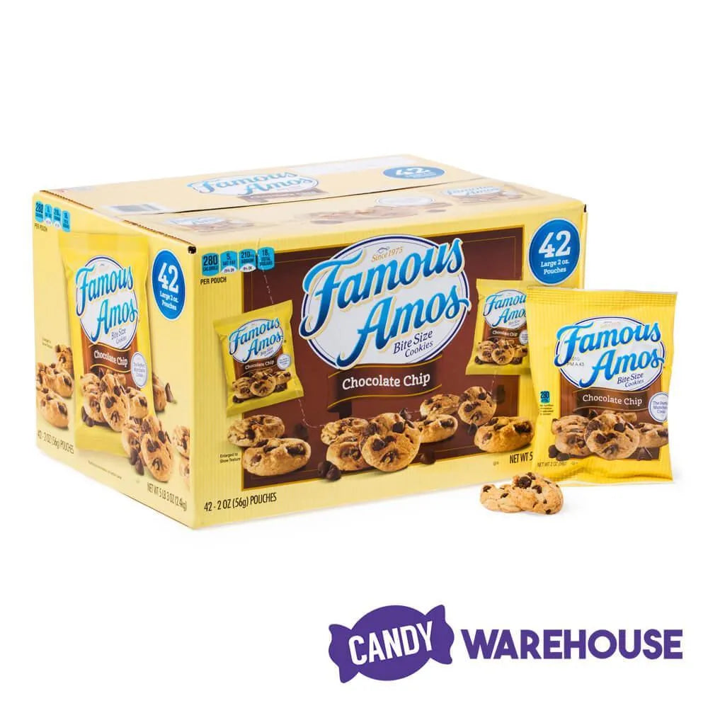 When nothing but the fresh flavor of homemade cookies will do, but you don’t have time to bake, reach for a box of Famous Amos bite size cookies. Crispy, crunchy, and loaded with premium semi-sweet chocolate chips, this small cookie satisfies your craving like no other chocolate chip cookies can. Famous Amos bite size cookies are conveniently packed in individual bags for easy snacking on the run, making the portable cookie packs in this 42-piece box ideal for kids’ lunches and parents’ purses. Stash a supply in your office desk or family car to deal with those pesky midday energy slumps. You can count on Candy Warehouse to get Wally Amos’ iconic chocolate chip cookies to you fast, fresh, and perfectly munchable.