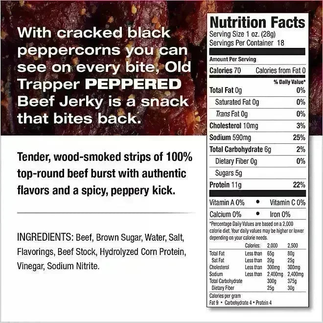 If a pepper grinder is your favorite kitchen gadget, wait till you get your hands on Old Trapper peppered beef jerky. Seasoned to perfection using a proprietary blend of spices and gobs of fresh pepper, each tender bite of this Old Trapper beef jerky delivers an explosion of savory flavor. The recipe starts with the best lean strips of 100% top round steak that are masterfully smoked the old-fashioned way using real wood chips and state-of-the-art technology from Germany. The moist, thick cuts of beef are packed in stay-fresh individual bags for convenient portability and anytime snacking.