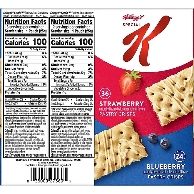 Special K Pastry Crisps Variety Pack is the perfect solution for satisfying your sweet cravings without the guilt! This 60-count pack includes 30 Strawberry and 30 Blueberry crisps, each with a light, flaky pastry crust, a sweet icing drizzle, and a gooey fruit-flavored filling. With only 100 calories and 7g of sugar per serving, these dessert-inspired snacks deliver big flavor in a perfectly portioned, on-the-go treat.
