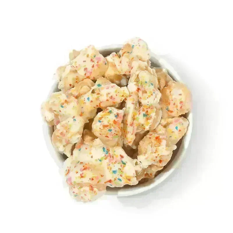 You know what everyone wears to a birthday party, right? An appetite for delights. This celebratory Birthday Cake Flavored Popcorn is swirled with white chocolatey frosting and coated with vanilla cream. Then we tossed all that birthday cake goodness with a sprinkling of sweet confectionary rainbow glitter. It's like a surprise party in your mouth: thrilling and sweet.