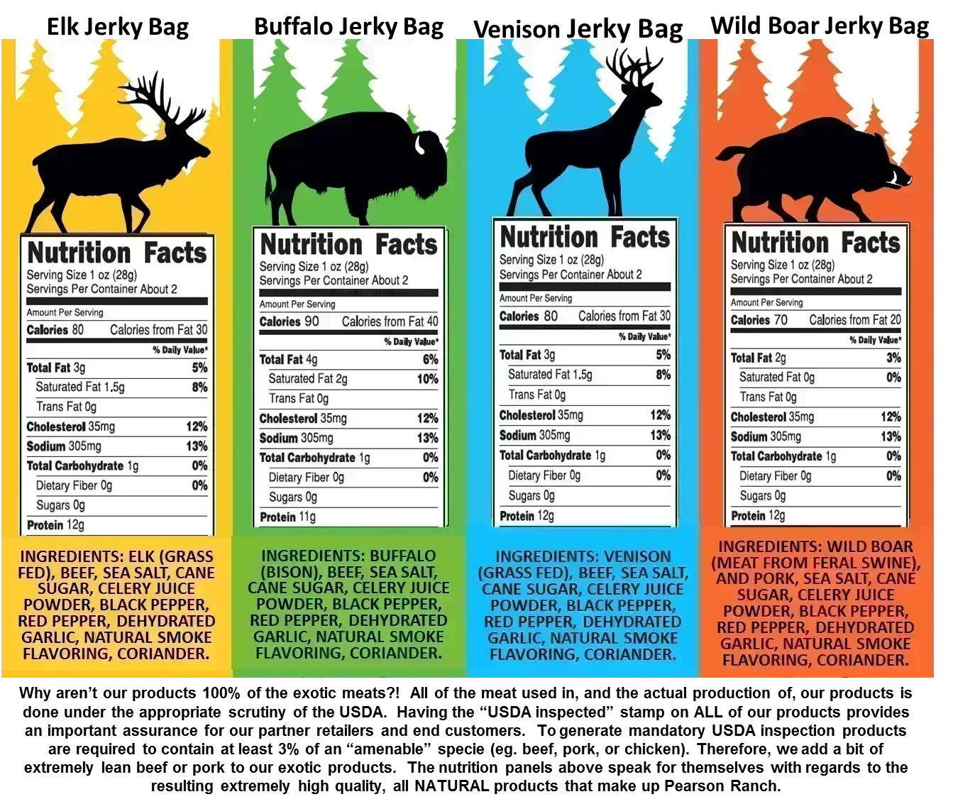Save 5% and try the best elk, buffalo, venison, and wild boar in America. Pearson Ranch Jerky’s Round Up! Variety Bundle is for you. It’s got twice the punch of our other packs, lets you try just about everything, and saves you money. Pretty sure you just stumbled on your dreams. Get your adventure started with: