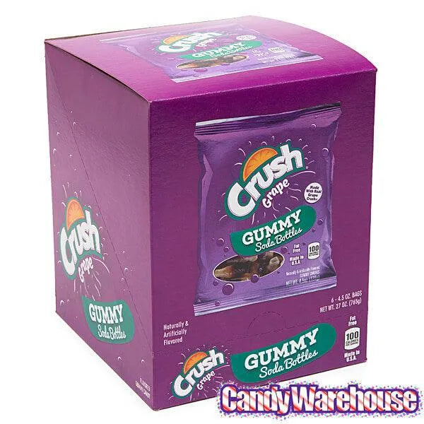 Display box contains 6 Grape Crush Soda Bottles Gummi Candy Bags, each with a net weight of 4.5 ounces.