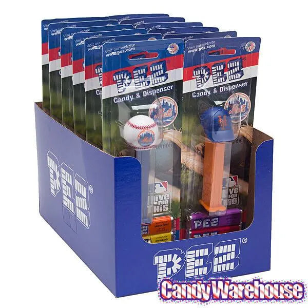 Display box contains 12 blister packs of MLB Baseball New York Mets PEZ Dispensers with Candy.
