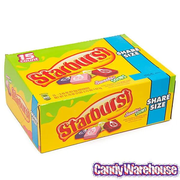 Display box contains 15 Starburst Fruit Chews King Size Candy Packs, each with a net weight of 3.45 ounces.