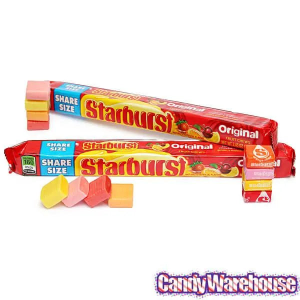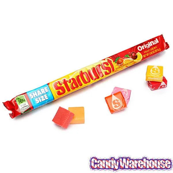 Succulent chewy candy squares featuring an assortment of fabulous fruit flavors:CherryLemonOrangeStrawberryDisplay box contains 24 Original Starburst Fruit Chews King Size Candy Packs, each with a net weight of 3.4 ounces.Shipping Weight ~ 6 lbs.